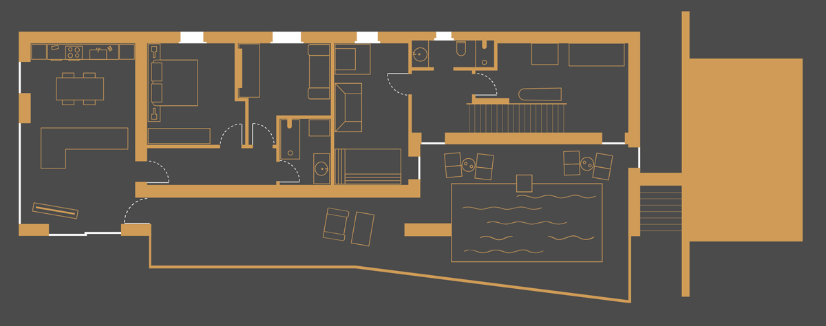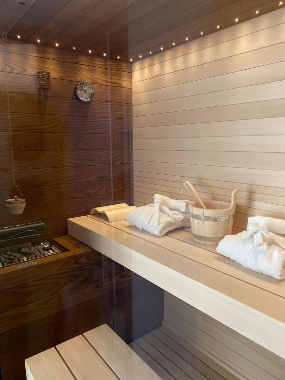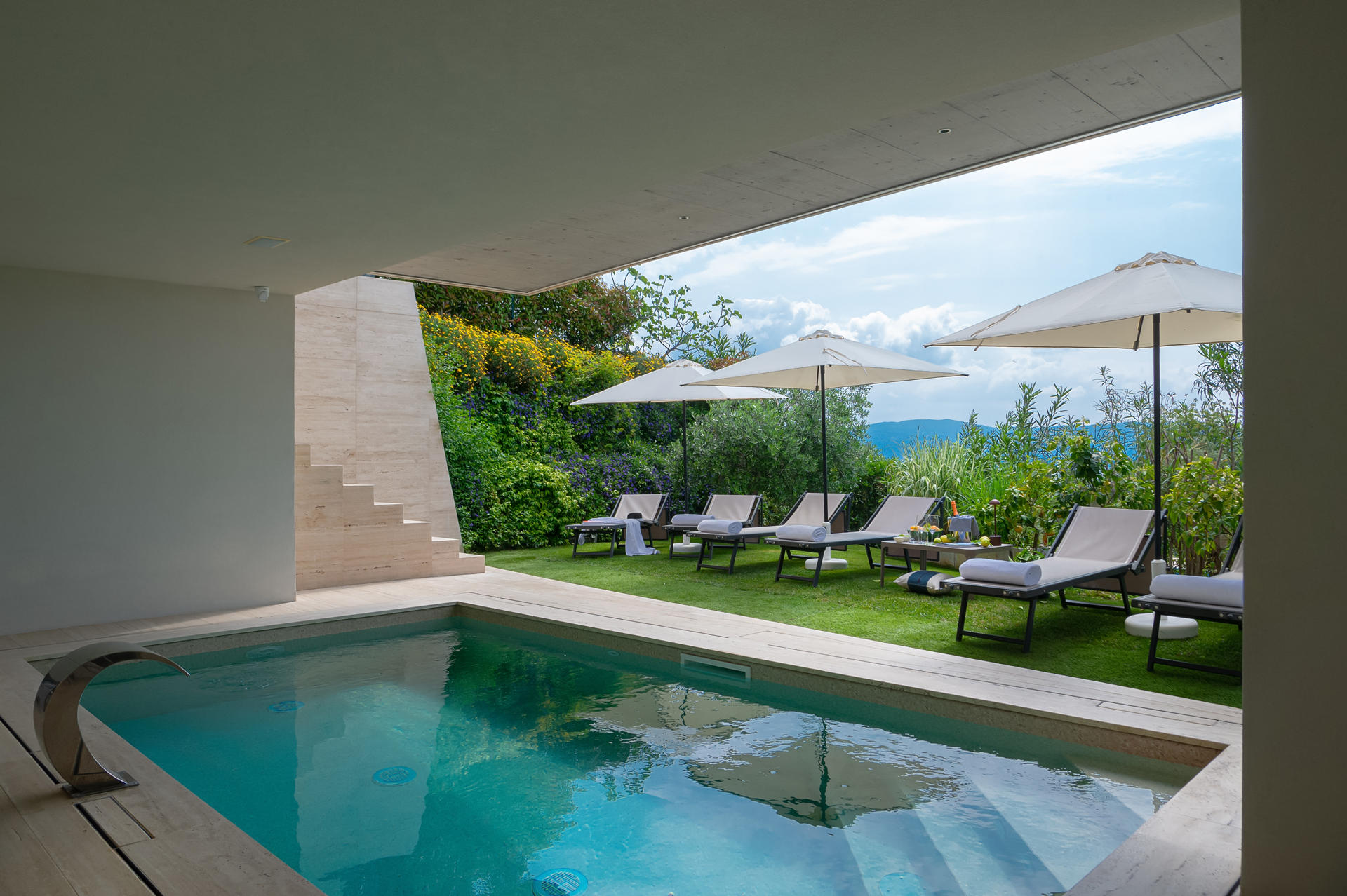 The heart of the outdoor wellness area is a magnificent heated outdoor pool with whirlpool, waterfall and counter-current swimming.